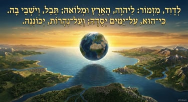 לְדָוִד מִזְמוֹר לַיהוָה הָאָרֶץ וּמְלוֹאָהּ תֵּבֵל וְיֹשְׁבֵי בָהּ; כִּי הוּא עַל יַמִּים יְסָדָהּ וְעַל נְהָרוֹת יְכוֹנְנֶהָ , תהילים כ"ד א'-ב'